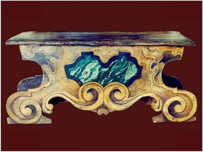 (Particolare) Cassapanca con alzata in abete massello dipinta a tempera magra eseguita in copia da un originale emiliano. L'alzata è proposta come variante all'originale.